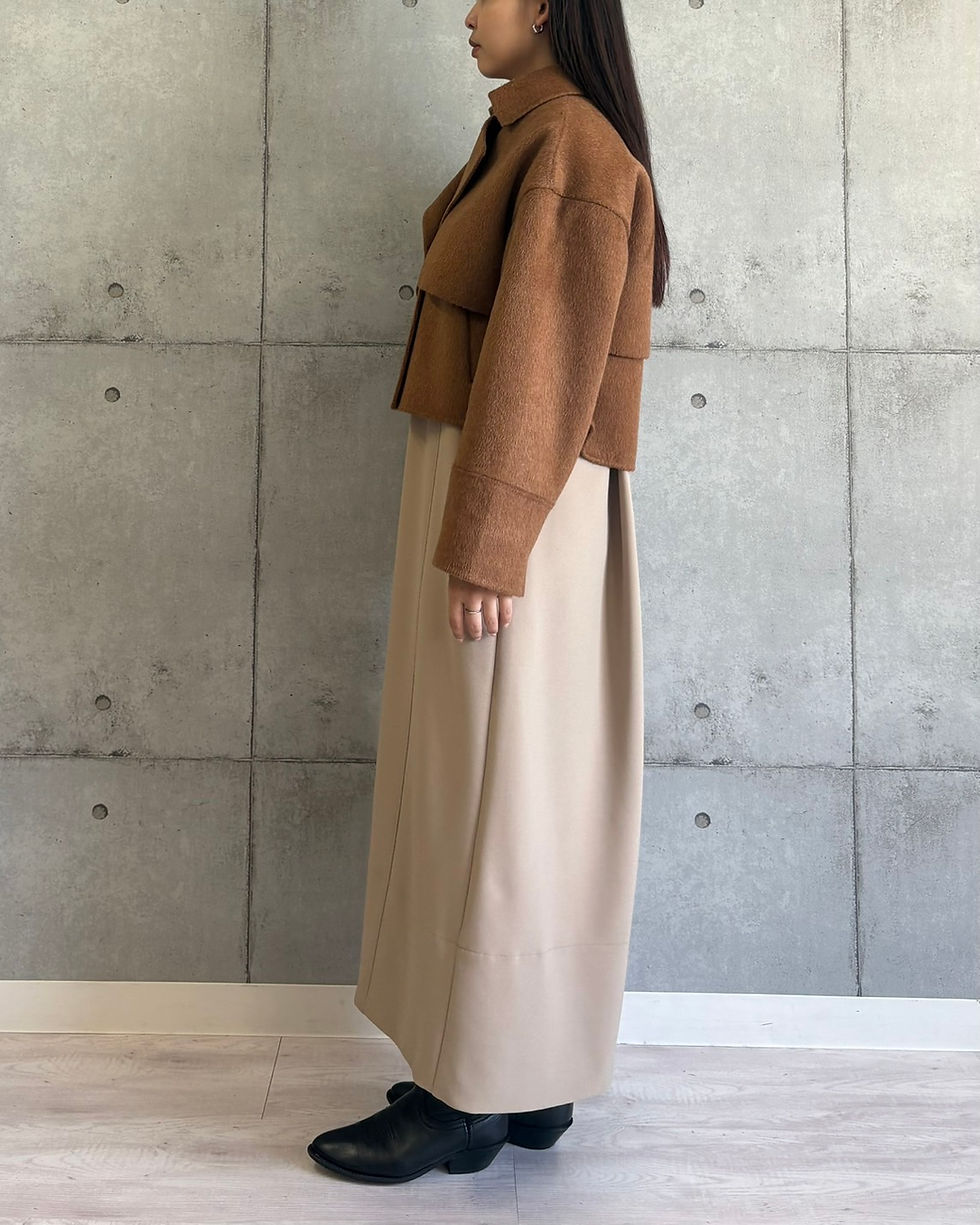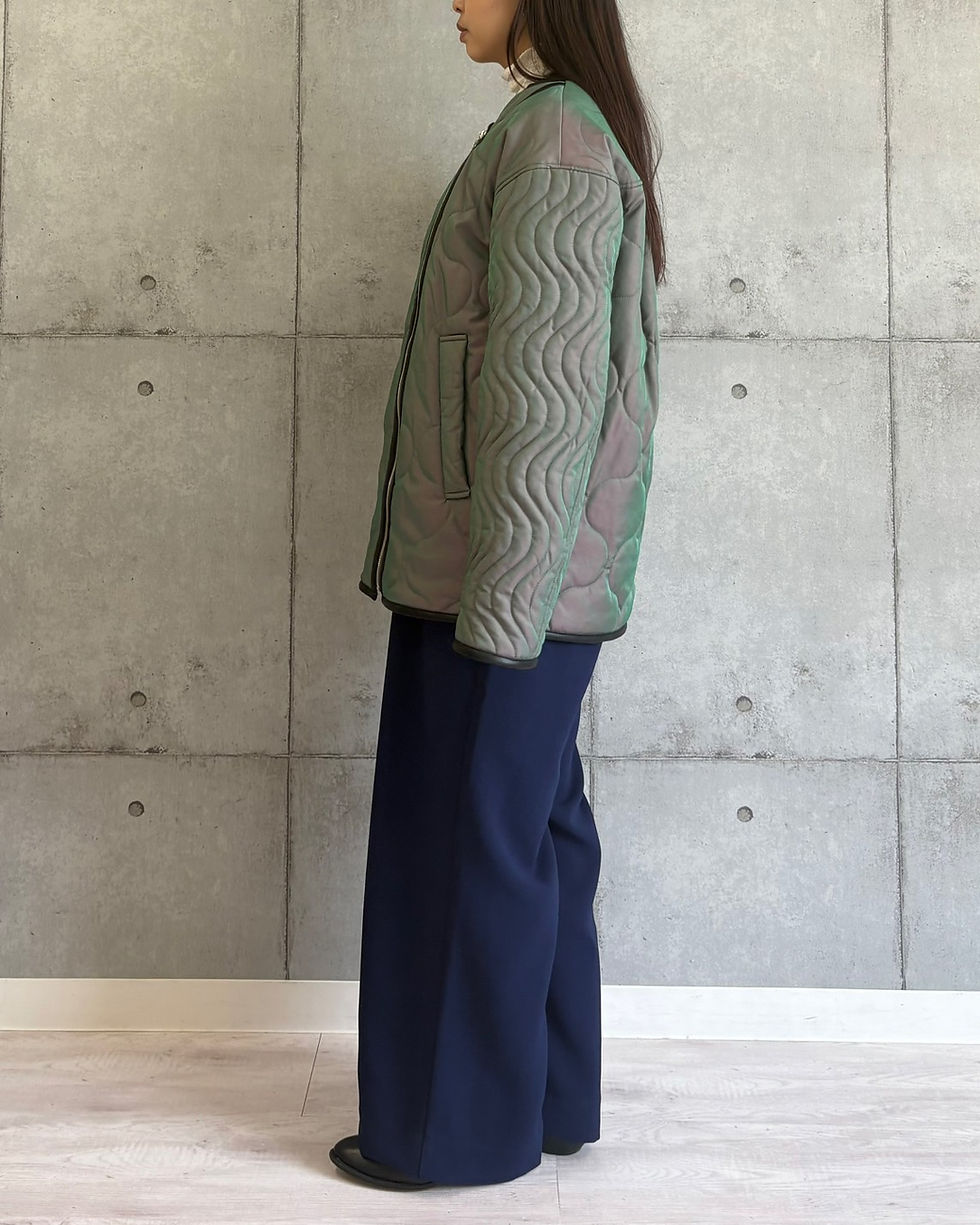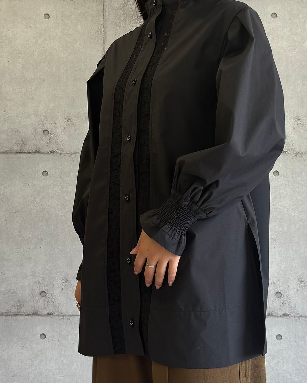 高密度で織られた、ハリ感と少しシャリ感のあるポリエステルコットンの素材に撥水加工を施した機能素材を使用。薄手ながらもしっかりとしたハリ感のある生地でウェストシャーリングが特徴的なデザインシャツ。少しワイドな身幅、肩幅をウェストのシャーリングでシェイプ。それぞれのバランスに拘った一枚。一見シンプルなシャツをレディーライクな一枚に仕上げました。